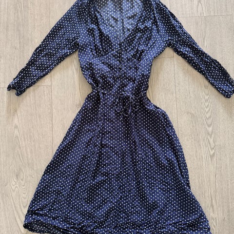 Søt og lett kjole med knytting på siden, rosa små ruter på mørk blå bakgrunn. Kan hentes i Stavanger eller sendes med Fiks ferdig.