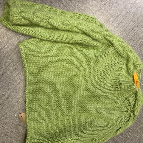 Hjemmestrikket. Strikket i Mohair,akryl,polyamid og polyester. Str xs. Flette mønster nedover armene. Kort modell rekker bare ned til bukselinningen .