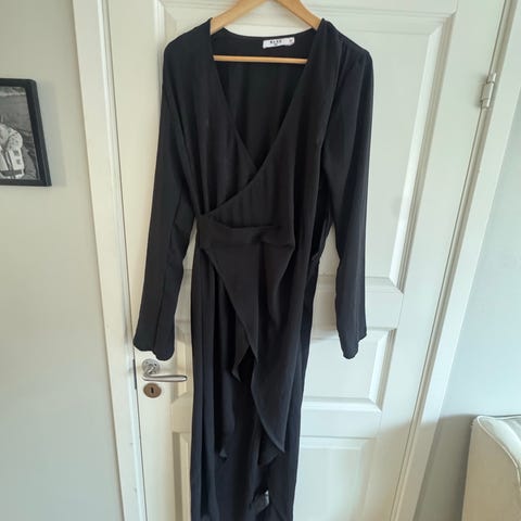 Penkjole str L/XL i silkeaktig stoff selges. Festet en sikkerhetsnål fordi jeg synes det ble mye utringning. Men den kan fjernes. Tøyelig stoff