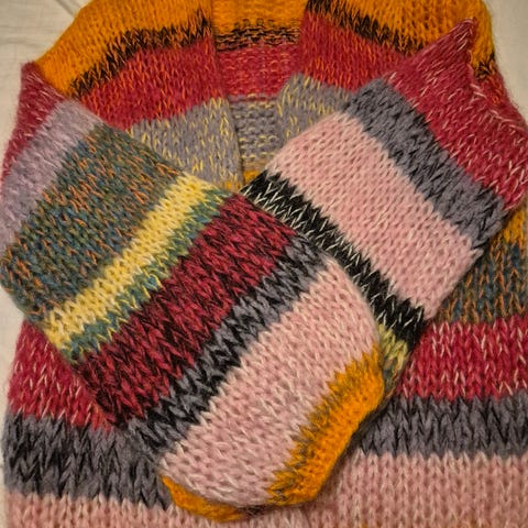 Ubrukt hjemmestrikket tykk og god tova ulljakke. Det er knytting øverst.