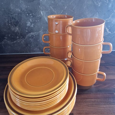 Vakkert gammelt retro / vintage kaffeservise produsert av den danske fabrikken Desireé. Selges samlet. 7 kaffekopper med 7 underfat, 5 kaketallerkner og 1 fløtemugge. Kopper måler 6 cm i høyden, underfat 13 xm og kakefat 17 cm. Desuten medfølger et ekstra underfat i serien Susanne fra Aluminia, som har litt avslag på kanten. Kopper i fin stand, underfat har flere krakkeleringer i overflateglasuren, kakefat har enkelte krakkeleringer i overflateglasur, se bilder for stand. Merket under: Desiree, Denmark. Serien heter Polar Matchline.
