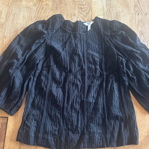 Søt, svart viskosebluse fra H&M. Er ikke brukt, men vasket en gang. Størrelsen er 44, men vil si at den passe en L/M. Knapp i nakken, litt puff/ballongarmer og mønster i stoffer/innsydde tråder.