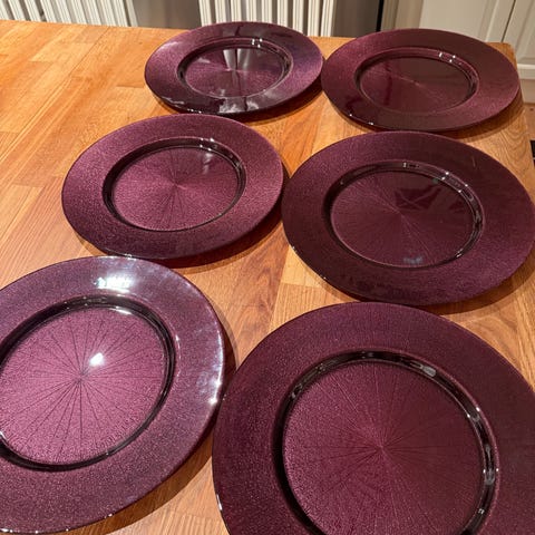 Dekketallerkner i rød 6 stk, brukt en gang. Fin til jul eller evt endre til ønsket farge, f.eks til bryllup, dåp, navnefest eller annen feiring.
