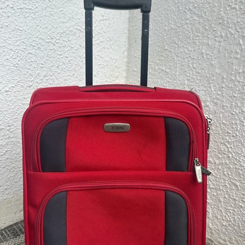 Vintage. Nostalgisk. fargerik.1960 talls. koffert. 1960's. Rød. Sort. Gul. Tøykoffert. Stoffkoffert.