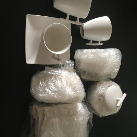 8 pent brukte kaffekopper med asjetter og tallerkner. Uten skår eller skjolder.Kopp diam. 10 cm.