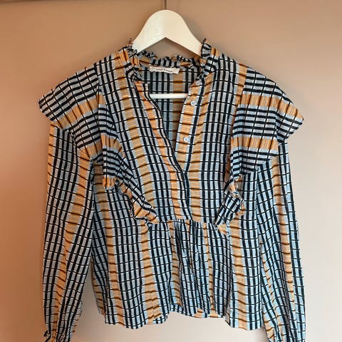 Bluse fra Samsøe selges kr 600. Brukt to ganger. Den er veldig fin i fasongen og har vide ermer med strikk nederst.