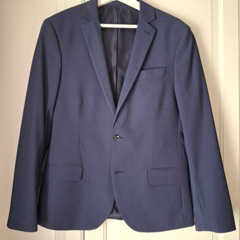 J Lindeberg mørkeblå navy dressjakke / blazer, størrelse ca small. Har noen lite synlige nupper ved den ene ermen og bak under