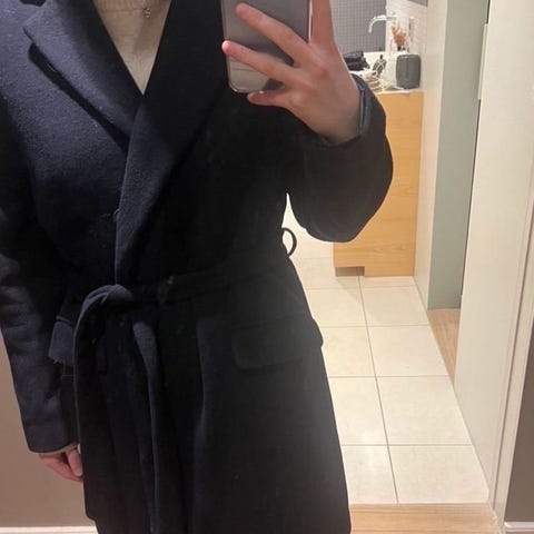 58 % ull 🐑 Har lommer og både knapper og belte som kan knytes rundt! Kåpen er så god som ny bortsett fra en liten åpning i sømmen på det ene ermet, men dette synes ikke og kan lett fikses