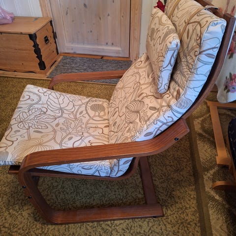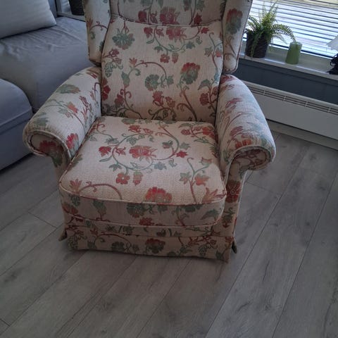 "Ørelappstol"/lenestol. God å sitte i. Trekt om en gang. Selges for kr. 1000.