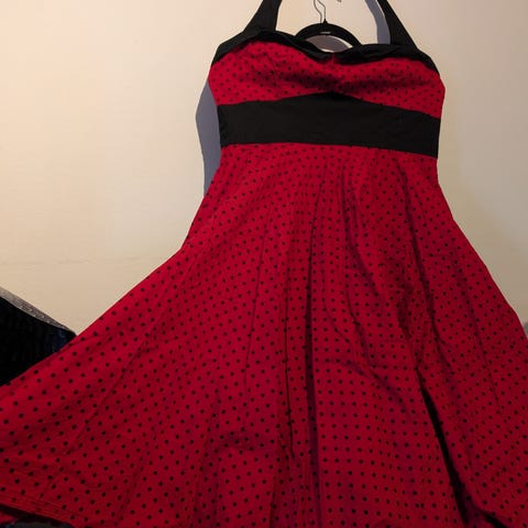 Hel og pen. Svart med små hvite prikker. Håndlaget av syerske. Får frem sin prakt med et underskjørt i tyll under.