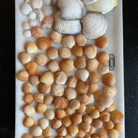 Selges samlet – pakke med dekorative gipsavstøpninger av skjell (fra IKEA Dofta), samt ett ekte skjell.