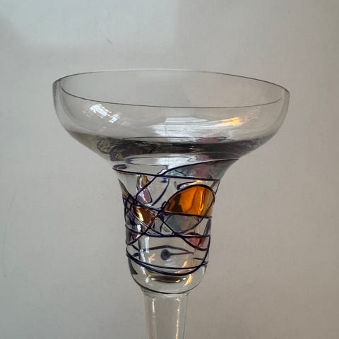 Lysestaken som er fra Hadeland er i fin blank krystall med striper og farge på nederste kulen. Høyde 16 cm, sokkelen har en diameter på ca 8 cm.