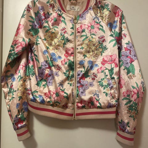 Svært pent brukt jakke i str 164. Nydelig blomstermønster i en fin fargekombinasjon. Stikklommer med trykknapp i sidene, ribbet kant nederst på jakken og ermene. Hel lenge fra skulder 61 cm, og jakken er lettvattert.