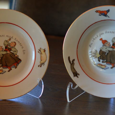 Gammelt og flott barneservise fra Porsgrund. Modellen heter "astra". Veldig lite slitasje, ingen krakelering eller nag. Stempler er grønne. Det ene slutter på nn og det andre nd. Det med nn tilhører en sjelden/lite brukt stempel fra Porsgrund fra perioden 1930-1945. Det med nd kan være fra 1913-1930? Diameter 18,5 på asjett og 16,5 cm på den som er dyp. Selges helst samlet. Kan sendes mot at kjøper betaler frakt. Usikker på priser så ønsker bud på dette.