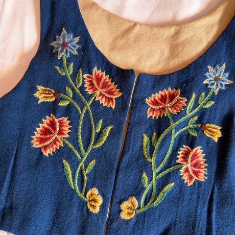 Eldre vest/liv til Sigdalsbunad. Mørk rød brokade med antikk gull bånd. Den er lagt ut max nå, men kan justeres inn.