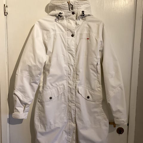 Ettersom jakken er hvit er det kommet en liten svak flekk neders på jakken, se bilde.