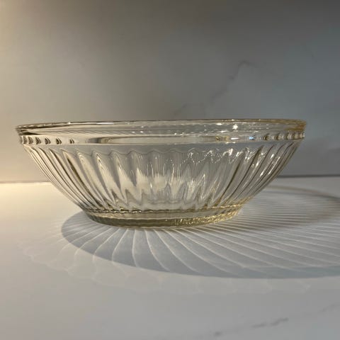 glassbolle, glasskål, bolle i glass, klar glassbolle, pressglass, mønstret glass, dekorativ skål, serveringsbolle, dessertbolle, salatbolle, fruktbolle, vintage glass, retro glass, klassisk glass, tidløs design, interiør, borddekking, servering, kjøkkentilbehør, glassdesign