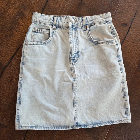 Svart denim skjørt med knapper foran. Skjørtet har to lommer foran og to lommer bak. Str 34 som nok tilsvarer XXS.