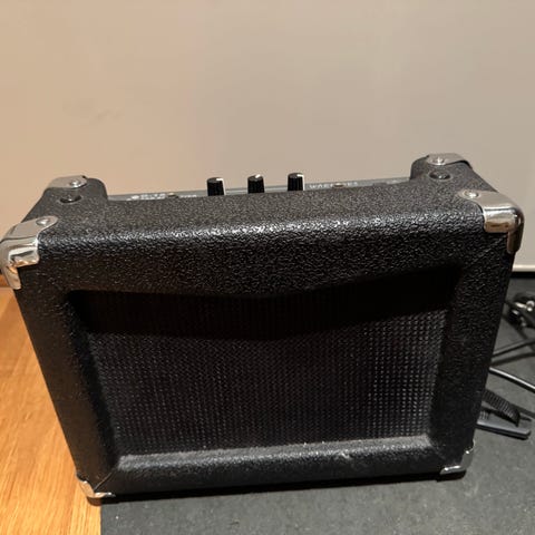 Flott gitarforsterker for nybegynnere. Mangler én av åtte hjørnebeskyttere(se bilde 9). Må hentes.