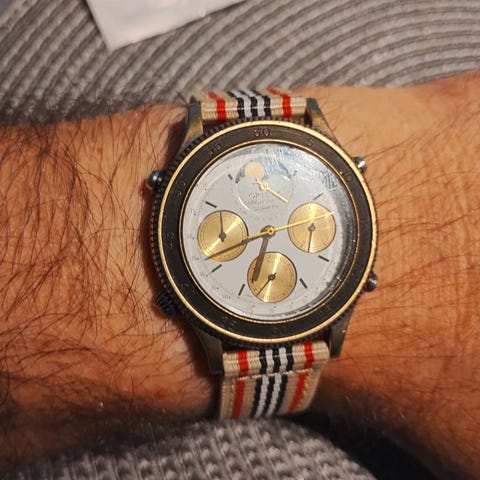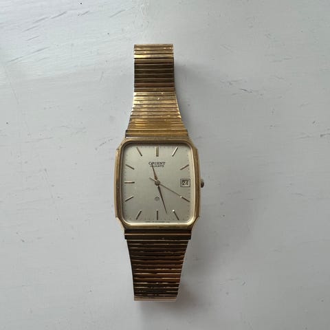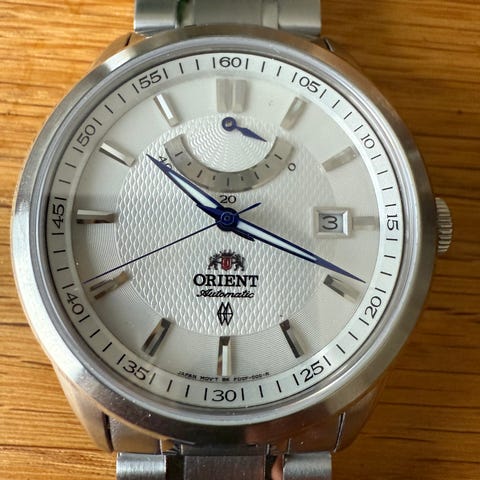Orient VX herreklokke, nydelig mørkblått skive, quartz urverk, original lenke. Ripefri glass og vanlige bruksmerker på uret og lenka. Batteri byttet 3.3.24.Kun klokka,ingen boks eller papirer.
