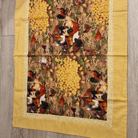 Hvit- og gulrutete påskeduk og grytekluter med blå høner. De er nok hjemmesydd. Løperen er 75 x 33 cm og gryteklutene ca 27 x 27 cm.