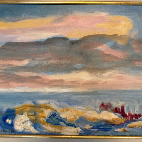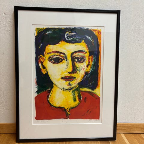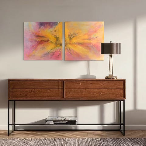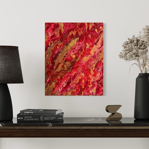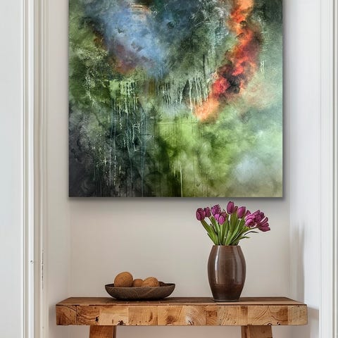 Abstrakt maleri på lerret med varme farger som burgunder, gul, grønn og hvit. Passer til veggdekorasjon i hjem eller kontor. Ingen ramme, lerretets mål er omtrent 30x40 cm.