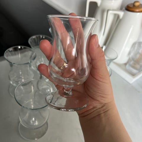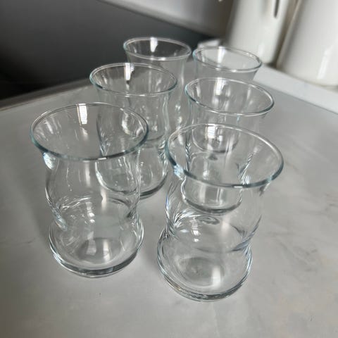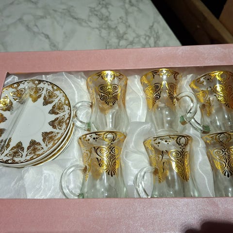 Tesett sett med 6 glass og asjetter glass brun dekor