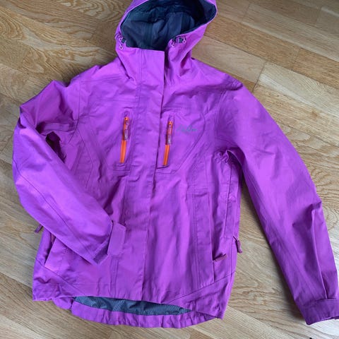 Skalljakke str 12 år. Den er brukt, så har noen merker, se bilder, og en liten rift bak på ryggen som er teipet. Lufting under armene og fast hette med strammemuligheter.