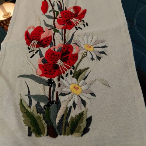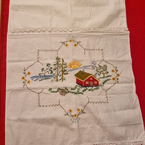 Sjeldent objekt, vintage brodert kaffeduk med brodert tekst.