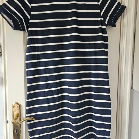 Myk og behagelig t-skjortekjole, i striper med mørkeblå og oransje, ny pris 360 kr. Ingenting galt med den eller størrelsen, kjøpte bare feil plagg.