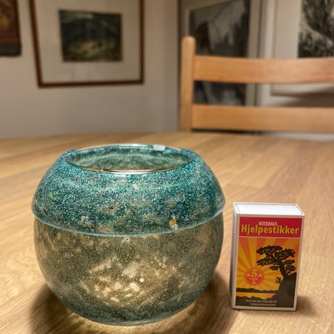 Ny pris! Jeg har spart på kunstglass fra B.M. lenge. Nå har jeg ryddet litt og ønsker å selge disse tre som du ser avbildet. En bolle: h 10,5 med diameter på 7 cm. Oljelampe med topp og en som mangler toppen(brukt som vase): h 9,5 cm og diameter på ca 10 cm.