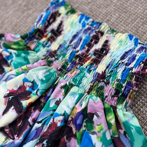 Super lett og myk i stoffet, med splitt. Perfekt bandeaukjole for sommeren. Stroppeløs og sitter nok bra.
