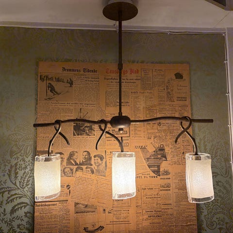 Høyde lampe: 32 cm+ lenke m/kopp 57 cm= 89 cm fra taket