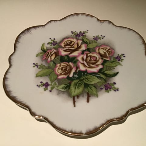 Rund brikke med motiv på selges. Laget av hans. J.a i 1957