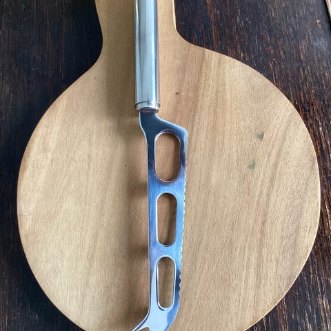 Selger en flott Ostehøvel med treskaft, dreid, med sving på tuppen og ring på skaftet. I god stand.