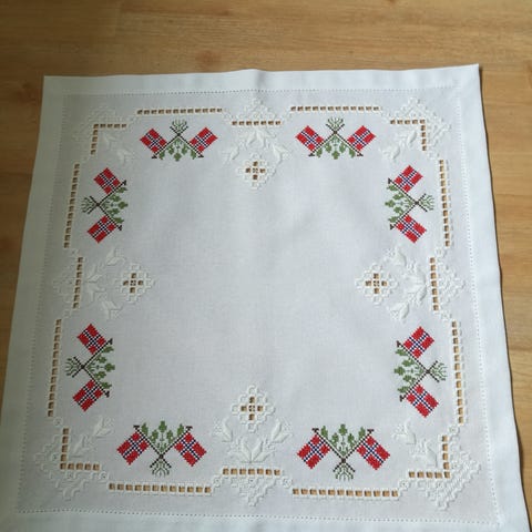 Selger en flott ny håndbrodert duk med fugler og nyper. Masse times brodering
