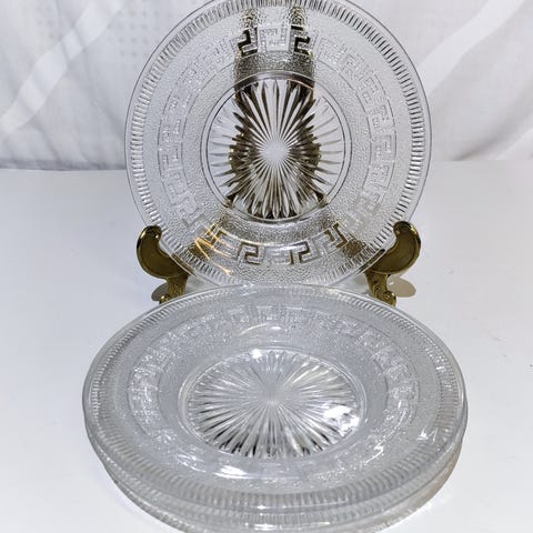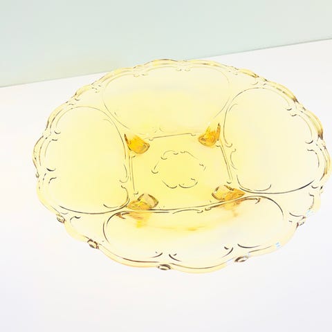 Selger vakre asjetter i gult glass med perlekant og skjærslipt blomsterdekor.