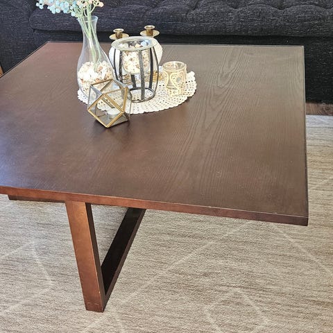 Har ett slikt stuebord med litt små riper på bordplate og ett støttebein som har blitt limt