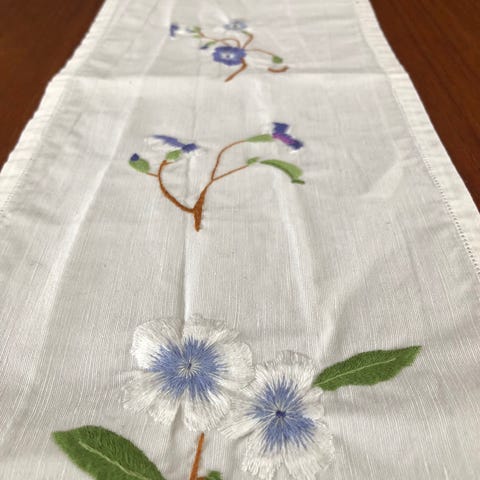 Hvit brodert løper med blomsterbroderi, i størrelse 80x23 cm.