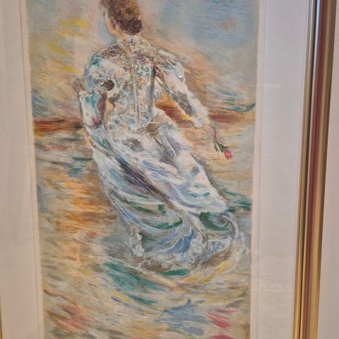 Selger flott bilde "Sommeren med Krøyer - Kunstnerens hustru stående på stranden i måneskinn" 1893. P. S. Krøyer. Profesjonelt innrammet med passepartout og ramme.