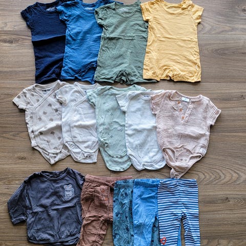 Alle plaggene er laget av myk bomull og er fint brukt, med litt preg av vask men ingen flekker. De er fortsatt i veldig bra stand og er klare for nye eventyr! Hovedsaklig "guttefarger", men kan også passe til jente.