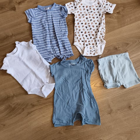 Selger en nydelig sommerpakke bestående av 5 bodyer med korte ermer og en t-skjorte, alle i størrelse 74. Bodyene og t-skjorten er fra populære merker som Name it, Cuddles & Smiles og Cubus, og de har søte print som vil få enhver baby til å se enda søtere ut!