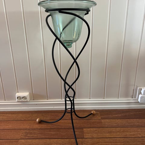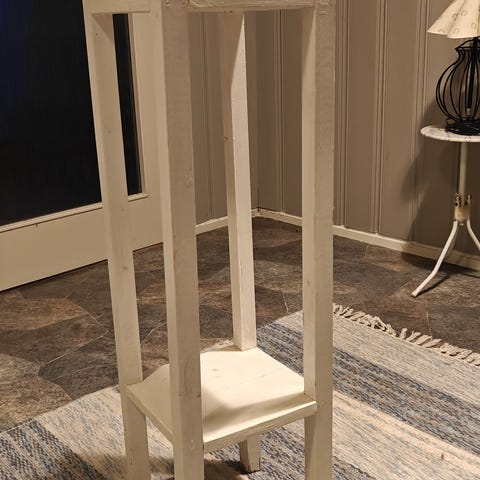 To pidestaller i tre. Mest sannsynlig hjemmelaget. Er i ok stand. Er noe tau under den ene. Usikkert om det har noe å si for stødigheten. Er 80 cm høy.