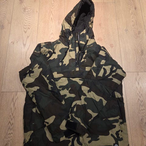 Pent brukt, foret anorakk i coated bomullsstoff, vannavstøtende. Fin som alpinjakke/skijakke/overgangsjakke. Camo-mønstret, grønn og brun. Str, small.