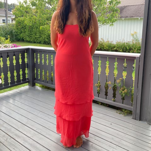 Flott kjole fraGina Bacconi i str 36 selges. Farge: coral. Kjolen er kjøpt på Lillestrøm, og ny pris er kr 4400,- Har cape som er festet til kjolen, lang splitt bak og glidelås i siden. Den er brukt kun en gang, er uten flekker og feil, og er som ny. Kjolen selges for kr 2500,- (Sko og veske som er avbildet sammen med kjolen kan selges separat. Skoene selges til kr 800, og veska til kr 600 ) Skoene og veska er også brukt kun en gang. Skoene er i Str 39. Kjolen ,skoene og veska kan sendes mot at kjøper betaler porto