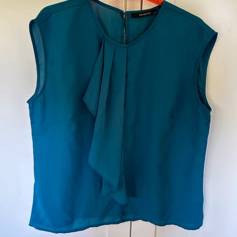Søt bluse med volang i en nydelig lys og dus grønnturkis /aqua farge. Str. L fra Lindex. Pent brukt, men har fått noen nupper, se bilder. Disse kan helt sikkert fjernes med en nuppefjerner. Selges derfor svært billig.