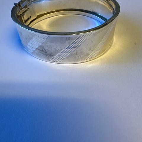 Spesielt armbånd fra 1937 selges for 500 kr. To cm bredt. Har en innvendig inskripsjon. Har en ørliten bøy på den ene siden. Trenger en puss.