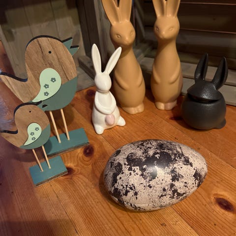 Selger desse tre søte harane eller påskekaniner i turkis om du vil. 10,5 cm høge, produsert i tre, kvitmalt og kroppen er dekt av turkis ull. Lagt i ei kasse, no vil dei flytte🌿