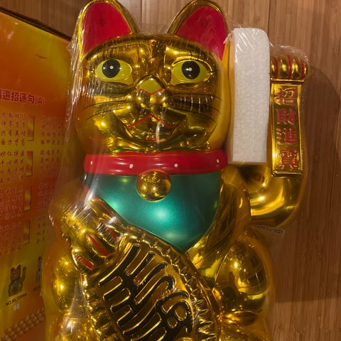 The maneki-neko (招き猫, lit. 'beckoning cat') is a common Japanese figurine which is often believed to bring good luck to the owner. In modern times, they are usually made of ceramic or plastic. The figurine depicts a cat, traditionally a calico Japanese Bobtail, with a paw raised in a beckoning gesture