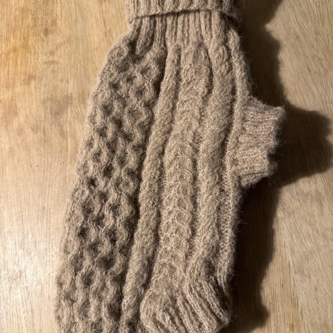 Nydelig hjemmestrikket hundegenser i 100% ull str s. Denne passer til feks hunderasen bichon Frise’ fargen er mørk grå, gul og sort.